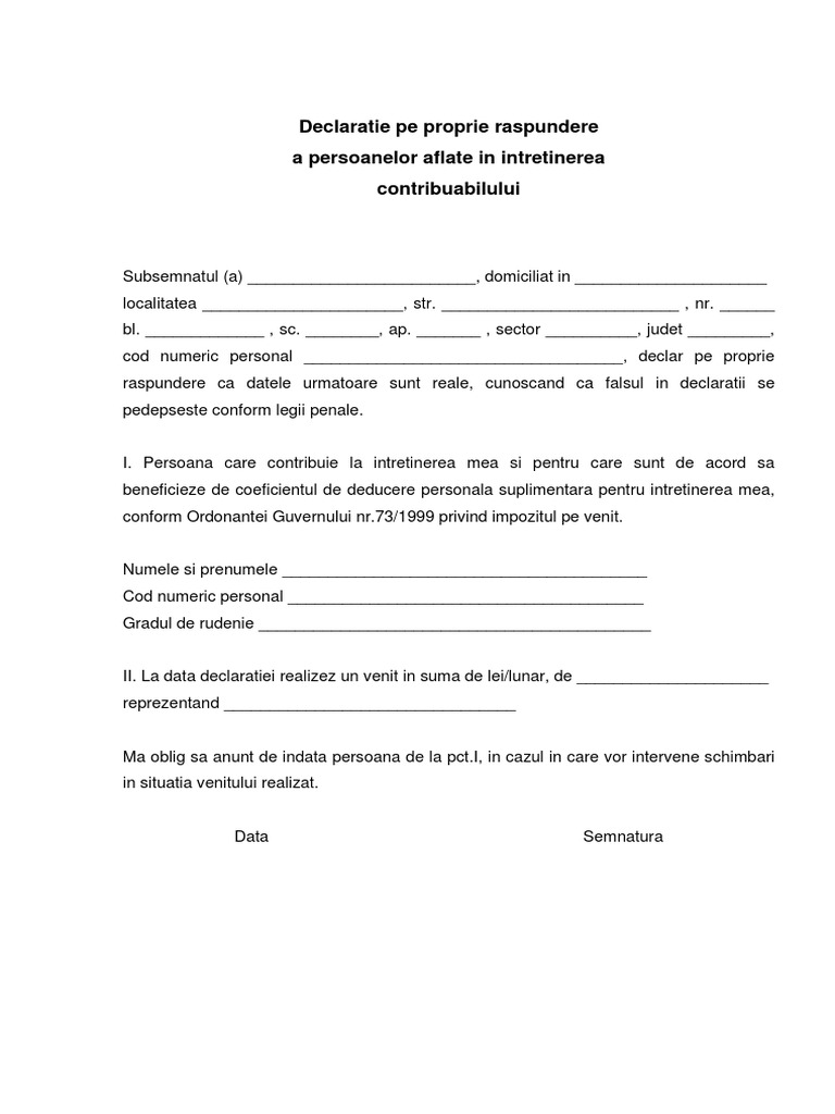 Declaratie pe propria raspundere persoane in intretinere. In cazul declararii in intretinere a altor persoane se va anexa documentele ce atesta gradul de rudenie declaratie pe propria raspundere a persoanei intretinute ca nu realizeaza venituri si ca se afla in intretinerea contribuabilului. 95 2006 privind reforma in domeniul sanatatii. Comitetul naţional pentru situaţii de urgenţă a stabilit joi seară care categorii de persoane vor fi exceptate de la măsura carantinei aplicate celor care ajung în românia din ţări cu risc epidemiologic ridicat precum şi suspendarea zborurilor către acestea un nou document sub forma unei declarații pe propria răspundere va trebui completat de toate persoanle care se întorc. Declarația pe propria răspundere a persoanei aflate în întreținere.