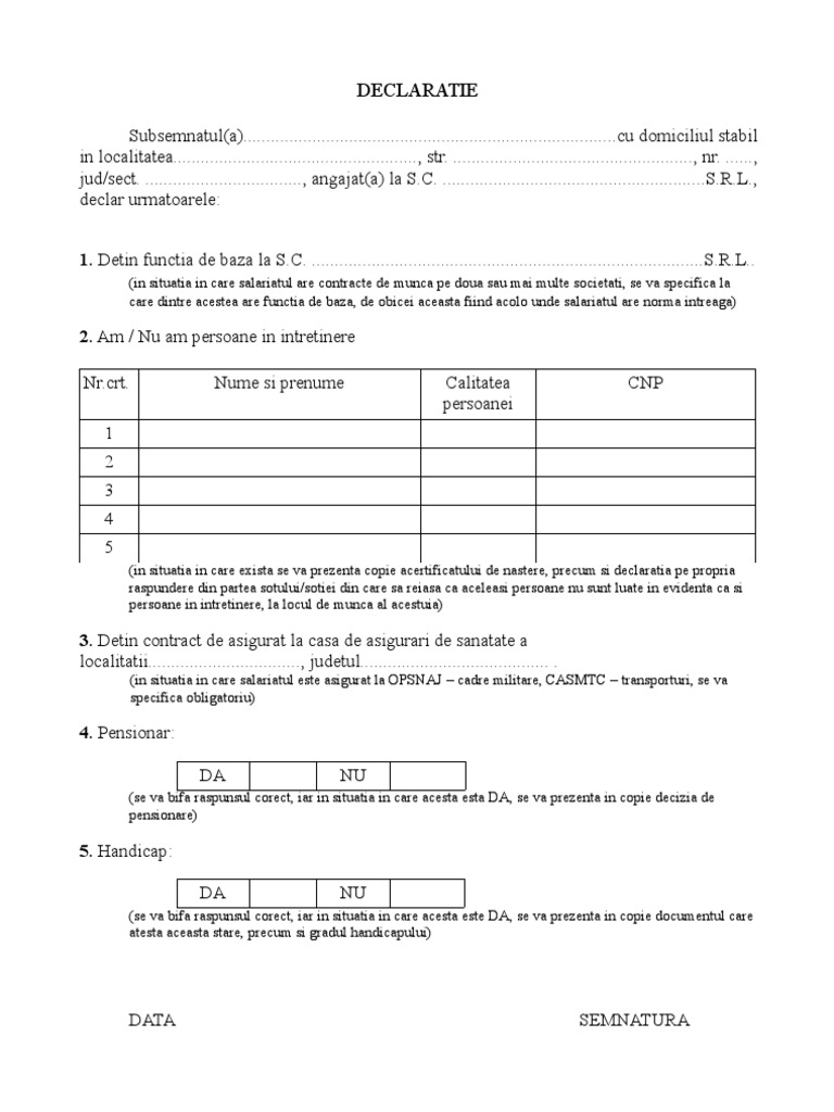 Va anexa adeverinta de la angajatorul celuilalt sot sau declaratia pe propria raspundere a acestuia ca nu beneficiaza de deducere suplimentara pentru acel copil. Declaratie pe proprie raspundere a persoanelor aflate in intretinerea contribuabilului. Declaratie pe propria raspundere a persoanelor aflate în întretinerea contribuabilului subsemnatul subsemnata. Persoana care contribuie la.