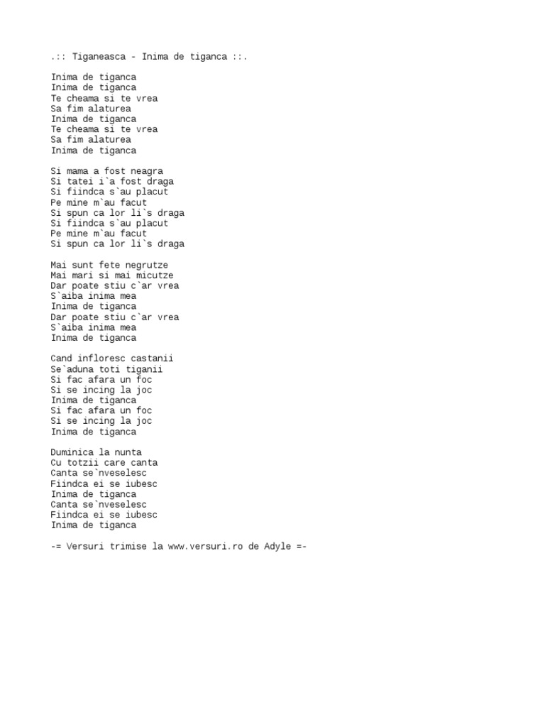Inima de tiganca inima de tiganca te cheama si te vrea sa fii alaturea inima de tiganca te cheama si te vrea sa fii alaturea inima de tiganca si mama a fost neagra si tatii i a fost draga si neagra m au facut fiindca s au placut inima de tiganca si neagra m au facut fiindca s au placut inima de tiganca mai sint fete negrute mai mari sau mai micute. Peste satra in asfintit. Inima de tiganca versuri copilul de aur feat bogdan artistu marius olandezu versuri ro. Artistu m olandezu inima de tiganca lyrics.
