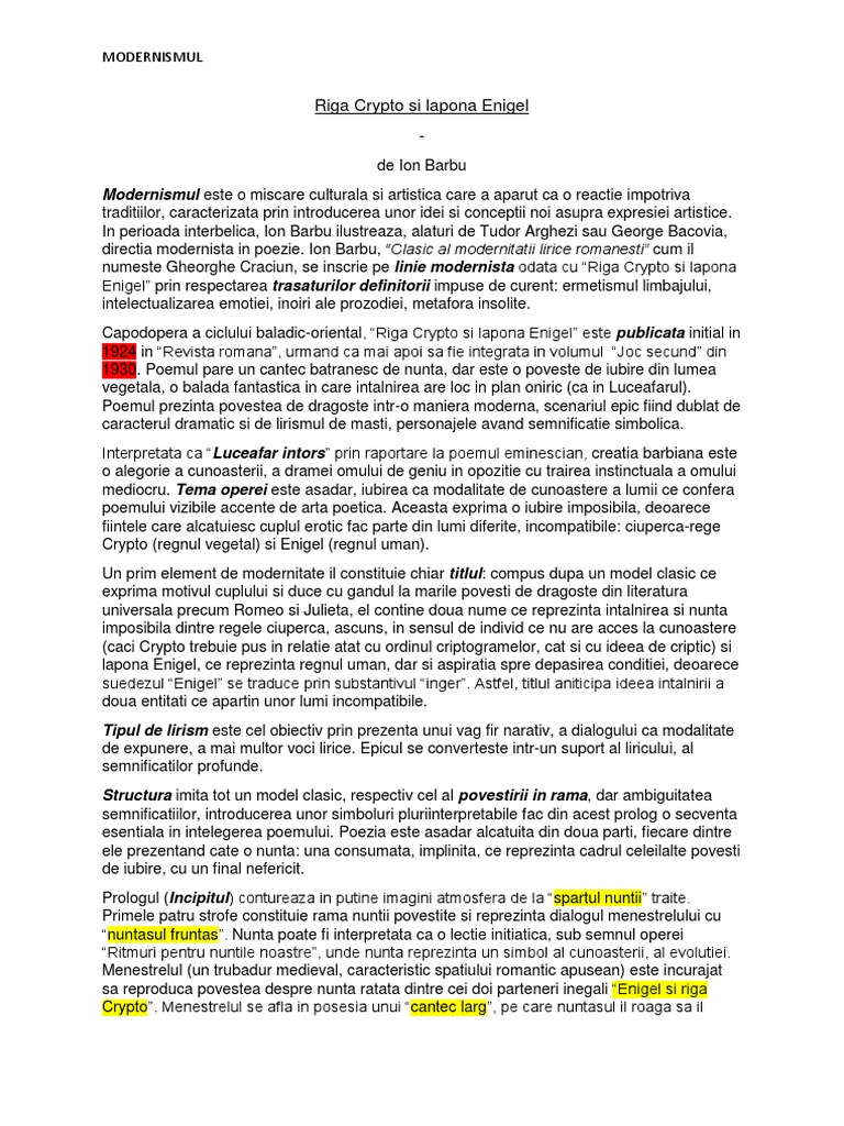 Riga crypto si lapona enigel de ion barbu 1 e o orientare larga si diversa in plan doctrinar si estetic prin care literatura romana se aliniaza literaturii europene. Publicată iniţial în 1924 integrată apoi în ciclul uvedenrode din volumul joc secund 1930 riga crypto şi lapona enigel prin problematică şi mijloace artistice anunţă dezvoltarea ulterioară a poeziei lui barbu. Riști prea mult si nu merită. Realizati un eseu structurat in care sa demonstrati ca o opera a lui ion barbu apartine modernismului de tip ermetic.