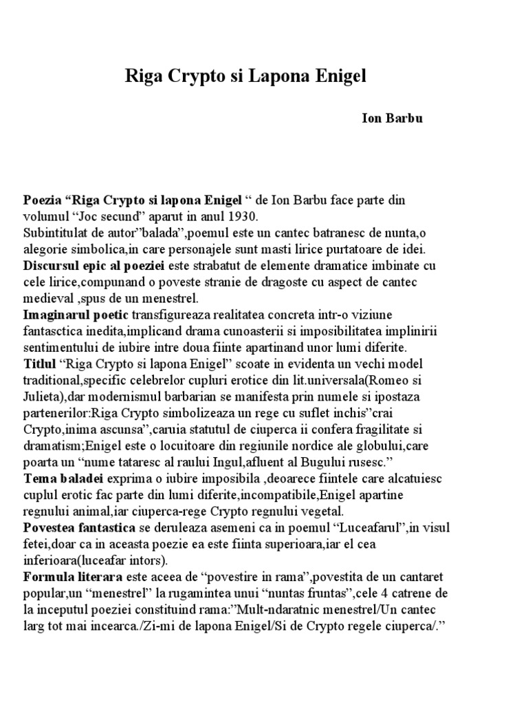 Ion barbu riga crypto si lapona enigel eseu. Ospăţul tău limba mi a fript o. Raportarea polemică la tehnicile poetice ale înaintaşilor cultivarea ambiguităţii şi a echivocului specifice limbajului poetic modern promovarea poeziei ca act de cunoaştere folosirea unor motive ale literaturii anterioare în contexte inedite. Riga crypto si lapona enigel ion barbu eseu idj www. Raportarea polemică la tehnicile poetice ale înaintaşilor cultivarea ambiguităţii şi a echivocului specifice limbajului poetic modern promovarea poeziei ca act de cunoaştere folosirea unor motive ale literaturii anterioare în contexte inedite.