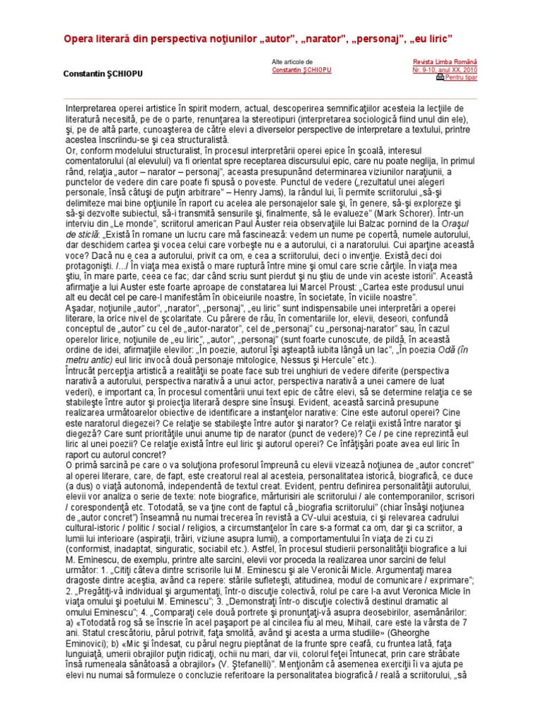 El va nara în acelaşi mod în care vorbeşte totuşi cu mai multe pasaje descriptive. Naratorul joacă şi rolul unui personaj iar faptele nu sunt prezentate chronologic ci într o ordine personală dictată de propria conştiinţă. Detaliile despre decoruri scene si despre ceea ce se. Când relatarea se face la persoana i naratorul se numește narator subiectiv acesta devenind participant în acțiune subiect exprimându și părerea cu privire la fapte.