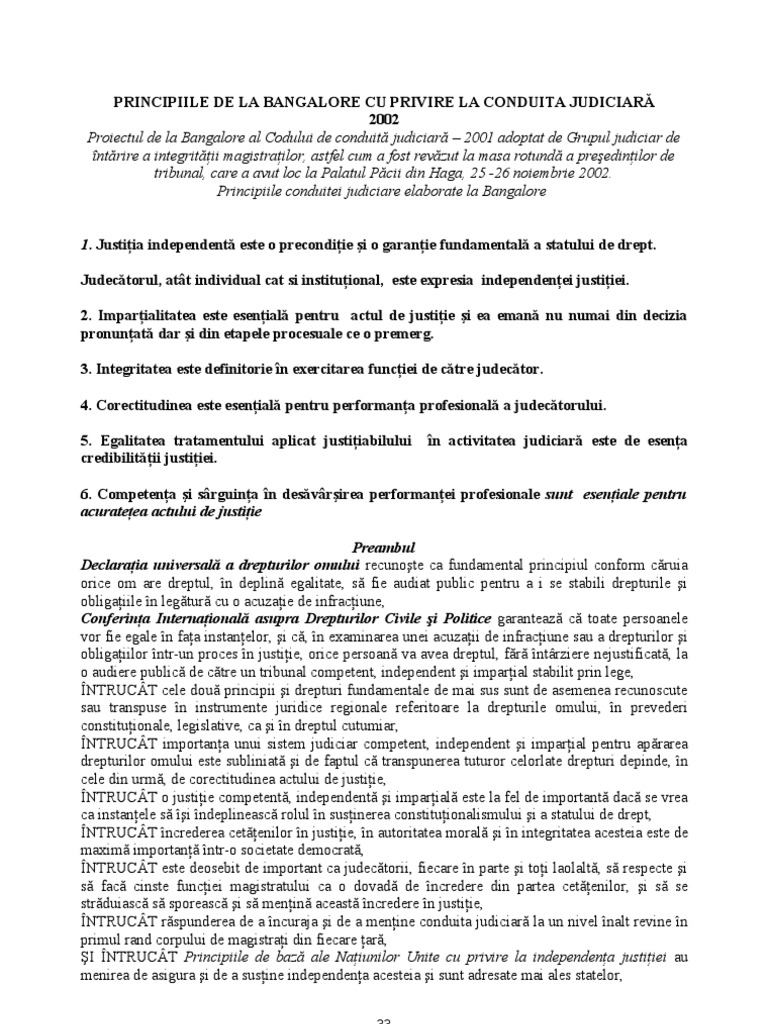 Principiile de la bangalore. Principiile de la bangalore privind conduita judiciara. Principiile de la bangalore privind conduita judiciară 2002 proiectul codului de conduită judiciară de la bangalore2001 adoptat de grupul judiciar pentru întărirea integrităţii justiţiei aşa cum a fost revizuit la masa rotundă a preşedinţilor curţilor supreme ţinută la palatul păcii haga 25 26 noiembrie 2002 preambul. Onu reajustează principiile de conduită ale magistraților din perspectiva noilor tehnologii. Proiectul de la bangalore al codului de conduită judiciară 2001.