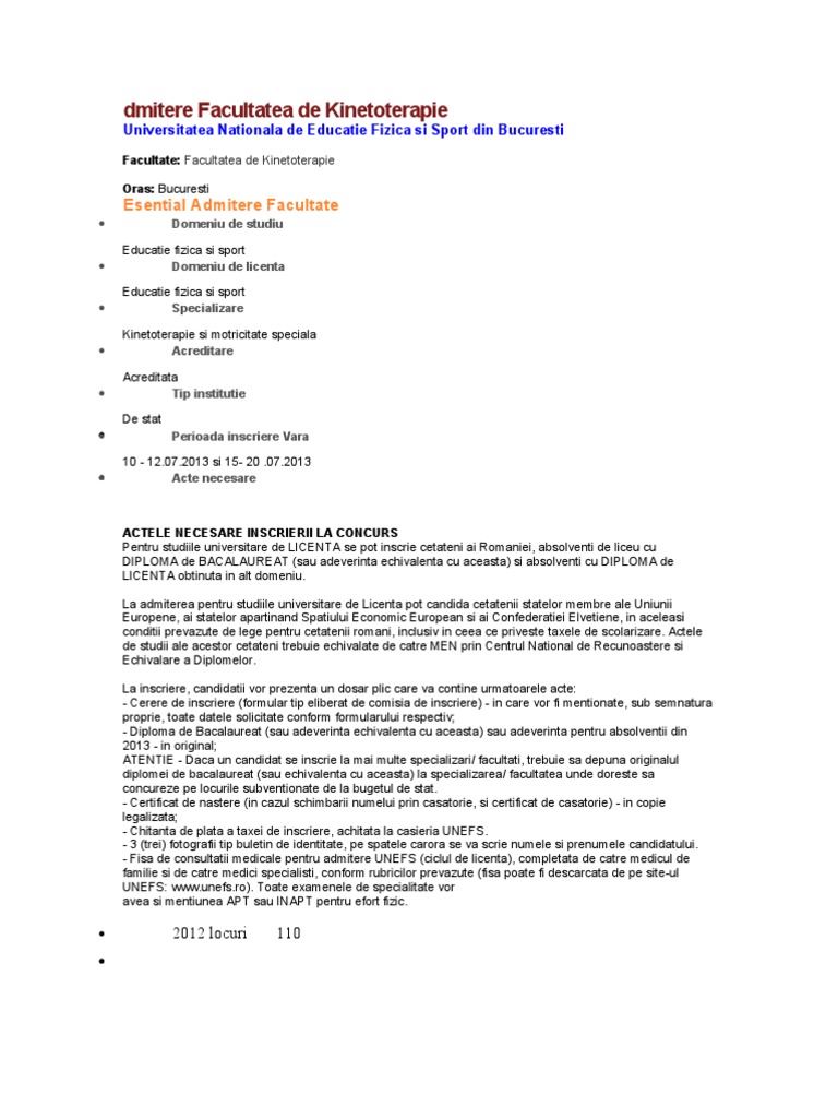 Subiecte admitere kinetoterapie bucuresti. Proba de educaţie fizică eliminatorie candidaţii care nu obţin cel puţin nota 5 cinci la aceastǎ probǎ sunt eliminaţi din concurs. Facultatea de kinetoterapie din cadrul unefs bucurești este singura facultate de profil din românia. Facultatea de kinetoterapie conţinutul probelor de concurs. A proba de educaţie fizică.