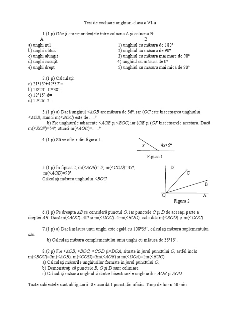 Un unghi cu măsura de. Clasa vi matematica. Unghiurile aob boc şi sunt unghiuri în jurul unui punct. Test din unitatea de invatare unghiuri din clasa a 6 a.