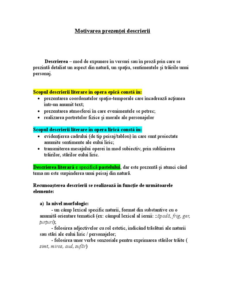Se caracterizeaza prin expresivitate obtinuta prin utilizarea imaginilor artistice si a figurilor de stil explorandu se indeosebi sensurile figurate ale cuvintelor se pot utiliza arhaisme regionalisme termeni populari si cuvinte a caror forma se abate de la normele limbii literare. In cuprins se desfac elementele componente ale peisajului si se descrie apoi fiecare detaliu al acestora. Reguli de redactare a descrierii literare in introducere se situeaza spatio temporal peisajul descris forme de relief anotimpul si momentul zilei ales. Eşti pe cale să postezi un mesaj care poate încuraja pirateria şi distribuţia ilegală de materiale pe internet.