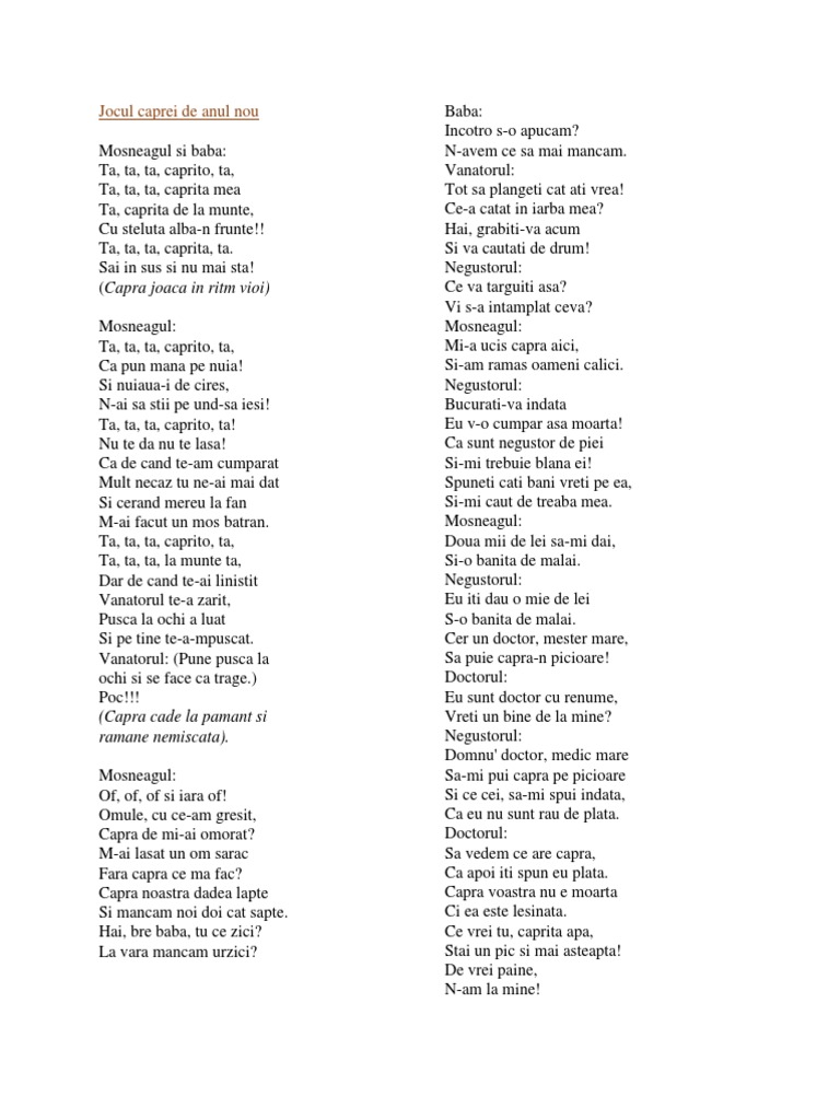 Agrointeligența vi le prezintă cu versurile lor originale care păstrează graiul și cuvintele cu semnificație veche. Si mai mari si mai marunte. Versuri capra de anul nou de urături. Mersul cu capra la oras difera de manifestarile populare fiind un obicei in vizibila disparitie cu trecerea fiecarui an in general acest obicei are loc pe data de 31 decembrie si consta in grupuri de cate 5 6 tineri care merg pe la usile rudelor si prietenilor pentru a juca scenele mortii bocirii inmormantarii si invierii caprei.